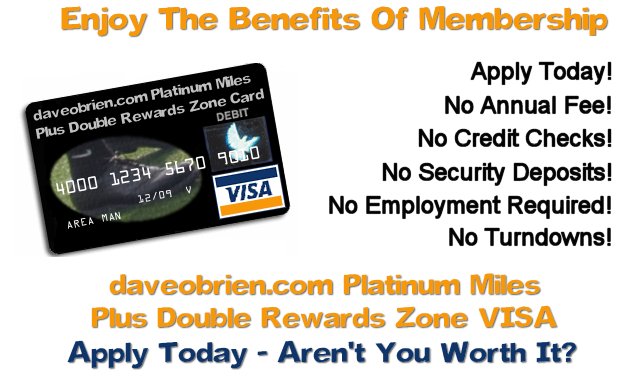 Latest Venture As part of the diversification of the daveobrien.com empire, we are pleased to announce our partnership with VISA. You can apply today for your daveobrien.com Platinum Miles Plus Double Rewards Zone VISA Card. Start earning double points from the first time you use it. Despite the 16 pages of 6 point fine print, no reason not to apply today! |